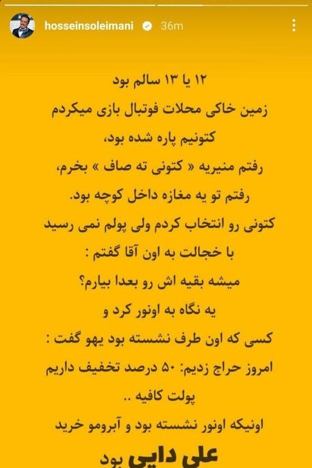 حسین سلیمانی بازیگر سینما و تلویزیون با انتشار یک استوری در اینستاگرامش خاطره جالبی از علی دایی منتشر کرد.