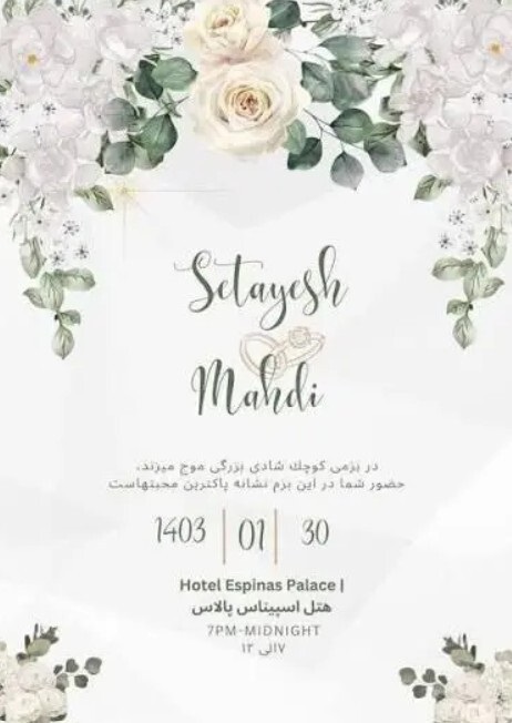 همزمان با انتشار فیلم، تصویری از کارت دعوت این عروسی نیز به بیرون درز کرد. هرچند جزئیات مندرج در کارت به دلیل کیفیت پایین یا عدم وضوح، به صورت قطعی قابل تأیید نیست، اما انتشار آن به شایعات دامن زد و بر رسمیتر شدن ابعاد این رویداد در فضای رسانهای افزود.