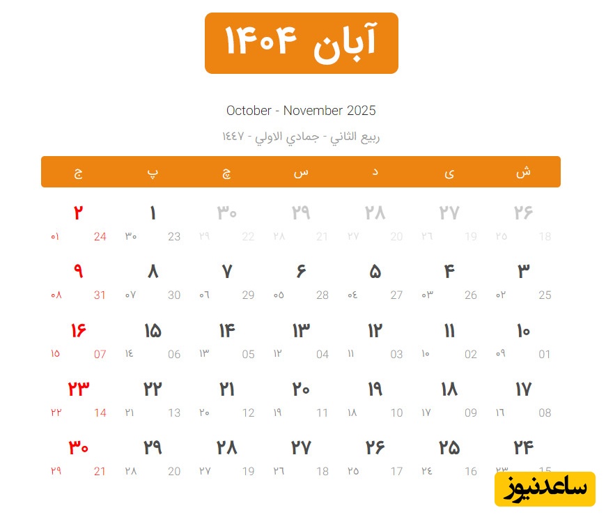 تقویم آبان 1404 + مناسبتهای این ماه و تعطیلات رسمی