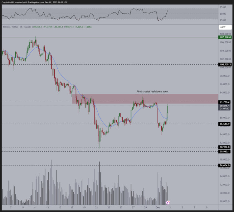 در میان تمام خوشبینیها، نواحی ۸۶,۰۰۰ تا ۸۸,۰۰۰ دلار به عنوان مناسبترین منطقه برای خرید بیت کوین در کوتاهمدت باقی مانده و ثبات قیمت بالای این ناحیه (که بارها آزمایش شده) نشانه کاهش فشار فروش بوده و نقش مانع مهمی برای آغاز اصلاح سنگینتر را ایفا میکند. شکست این ناحیه به معنای از دست رفتن کنترل بازار توسط خریداران و احتمال آغاز موج فروش از سوی هولدرهای بزرگ خواهد بود.