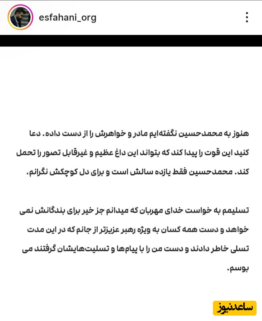 «هنوز به محمدحسین نگفته ایم مادر و خواهرش را از دست داده. دعا کنید این قوت را پیدا کند که بتواند این داغ عظیم و غیرقابل تصور را تحمل کند. محمدحسین فقط یازده سالش است و برای دل کوچکش نگرانم.