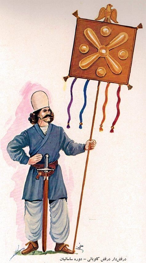 درفش کاویانی یا پرچم ساسانیان یکی از کهنترین پرچمهای جهان است که بدست آهنگری دلاور، کاوه، که برای در هم کوبیدن ستم و شکنجه بیدادگران تازی به پا خواست بر افراشته شد و به همین دلیل به پرچم کاوه آهنگر نیز شهرت دارد. فردوسی در چکامه های خود رنگ این پرچم را سرخ و زرد و بنفش آورده است: