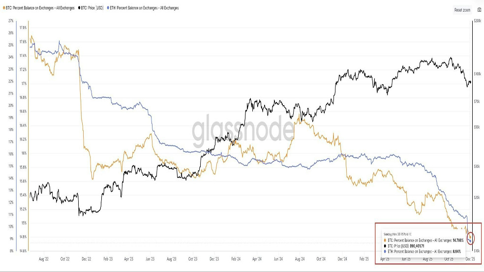 تحلیلگران میگویند کاهش بیسابقه میزان اتریوم در صرافیهای متمرکز میتواند به کمبود عرضه و فشار صعودی منجر شود. دادههای گلسنود (Glassnode) نشان میدهد که موجودی اتریوم در صرافیها هفته گذشته به ۸.۷ درصد رسیده که پایینترین سطح از سال ۲۰۱۵ محسوب میشود.
