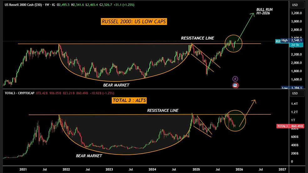 کارشناس بازار رمزارز اَشکریپتو (Ash Crypto) نیز چشمانداز صعودی را تأیید میکند. او میگوید شاخص راسل ۲۰۰۰ (Russell 2000) مهمترین سیگنال آغاز فصل آلتکوینها است و اکنون در آستانه ثبت سقف تاریخی جدید قرار دارد. این شاخص و ارزش بازار آلتکوینها هر دو در نوامبر ۲۰۲۱ سقف چرخه را ثبت کردند و پس از آن وارد بازار نزولی طولانی شدند. اکنون راسل دوباره به همان مقاومت رسیده و شکست آن میتواند آغاز یک روند صعودی بزرگ تا ۲۰۲۶ باشد.