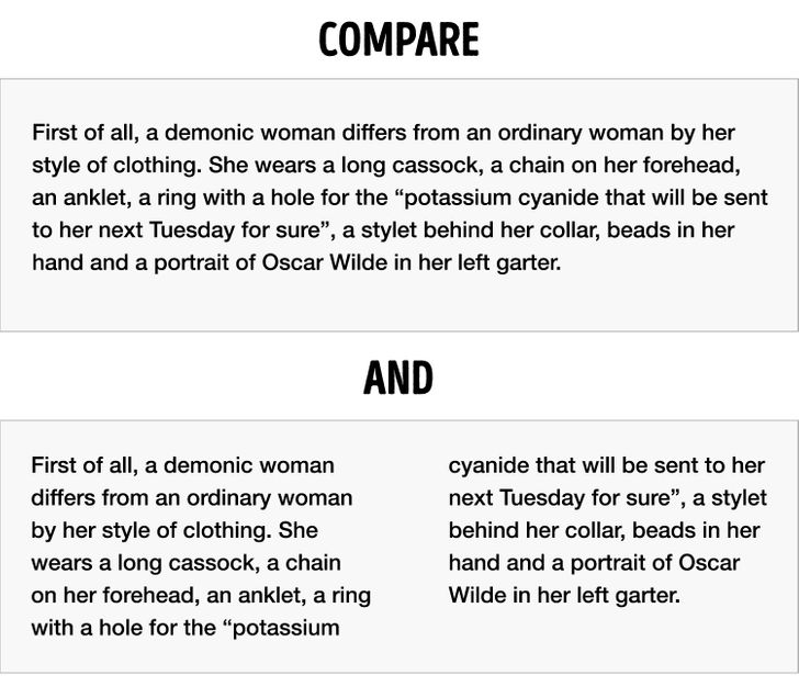 تحقیقات نشان داده اغلب افراد تصویر اول که یک متن ۵ خطی است را سریع تر از تصویر دوم می خوانند که همان متن است اما در آن طول خطوط کوتاه تر و تعداد خطوط هم تقریباً ۲ برابر شده است. برای دستیابی به بهترین سرعت خوانش، هر خط باید حدود ۱۰۰ کاراکتر طول داشته باشد.