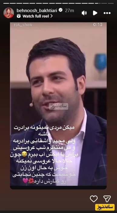 ویدیویی که ملاحظه کردید مربوط به استوری بهنوش بختیاری در خصوص مجید واشقانی که می گوید واشقانی مثل برادر برایم هست و منتظرم تا عروسیش در آبکش برای او آب ببرم!