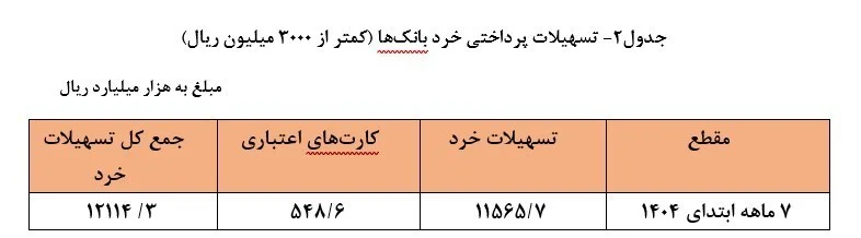 از کل تسهیلات پرداختی در دوره یاد شده، مبلغ 11565.7 هزار میلیارد ریال معادل 21.1 درصد به صورت تسهیلات خرد اعطا شده است. همچنین مبلغ 548.6 هزار میلیارد ریال نیز در قالب کارتهای اعتباری انجام پذیرفته است، که با احتساب این مبلغ، کل تسهیلات پرداختی خرد (کمتر از سه میلیارد ریال) به مبلغ 12114.3 هزار میلیارد ریال معادل 21.9 درصد کل تسهیلات پرداختی را شامل میشود. شایان ذکر است با توجه به اینکه تسهیلات پرداختی در قالب کارتهای اعتباری نیز در بخش خانوار پرداخت شده است، با این اوصاف سهم بخش خانوار از 23.9 درصد در جدول-1، به 24.6 درصد کل تسهیلات پرداختی افزایش مییابد.(جدول2)