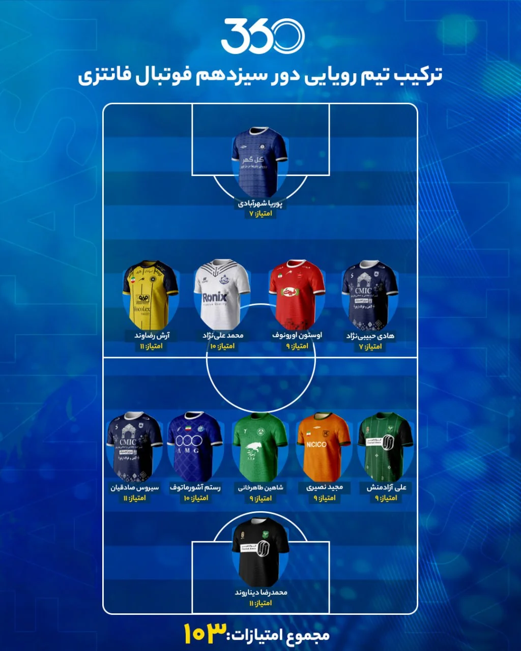 در هفتهای که با 10 گل همراه بود، تیم رویایی فوتبال فانتزی باز هم با کمترین حمله و بیشترین تمرکز روی دفاع ساخته شد و رکورد 103 امتیاز را ثبت کرد.