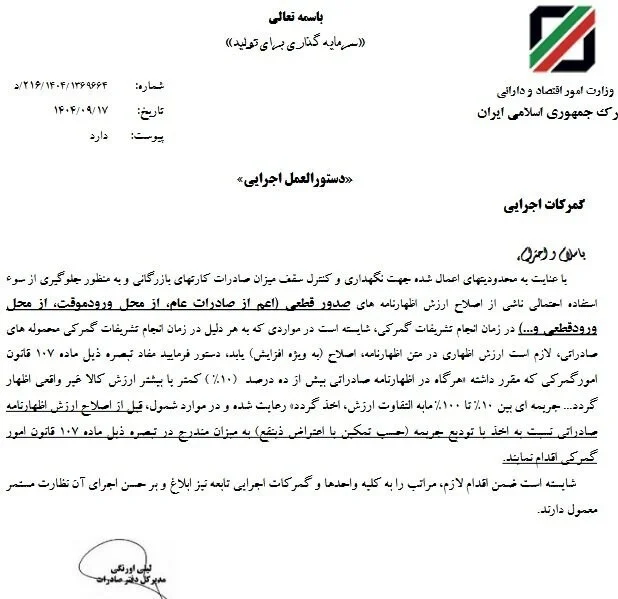 با عنایت به محدودیتهای اعمال شده جهت نگهداری و کنترل سقف میزان صادرات کارتهای بازرگانی و به منظور جلوگیری از سو استفاده احتمالی ناشی از اصلاح ارزش اظهارنامههای صدور قطعی (اعم از صادرات، عام از محل ورود موقت، از محل ورود قطعی و….) در زمان انجام تشریفات گمرکی، شایسته است در مواردی که به هر دلیل در زمان انجام تشریفات گمرکی محمولههای صادراتی لازم است ارزش اظهاری در متن، اظهارنامه اصلاح به ویژه افزایش یابد، دستور فرمائید مفاد تبصره ذیل ماده 107 قانون امور گمرکی که مقرر داشته «هر گاه در اظهارنامه صادراتی بیش از ده درصد (10٪) کمتر یا بیشتر ارزش کالا غیر واقعی اظهار گردد… جریمهای بین 10 تا 100% مابهالتفاوت ارزش اخذ گردد»، رعایت شده و در موارد شمول قبل از اصلاح ارزش اظهارنامه صادراتی نسبت به اخذ با تودیع جریمه (حسب تمکین با اعتراض ذینفع) به میزان مندرج در تبصره ذیل ماده 107 قانون امور گمرکی اقدام نمایند.