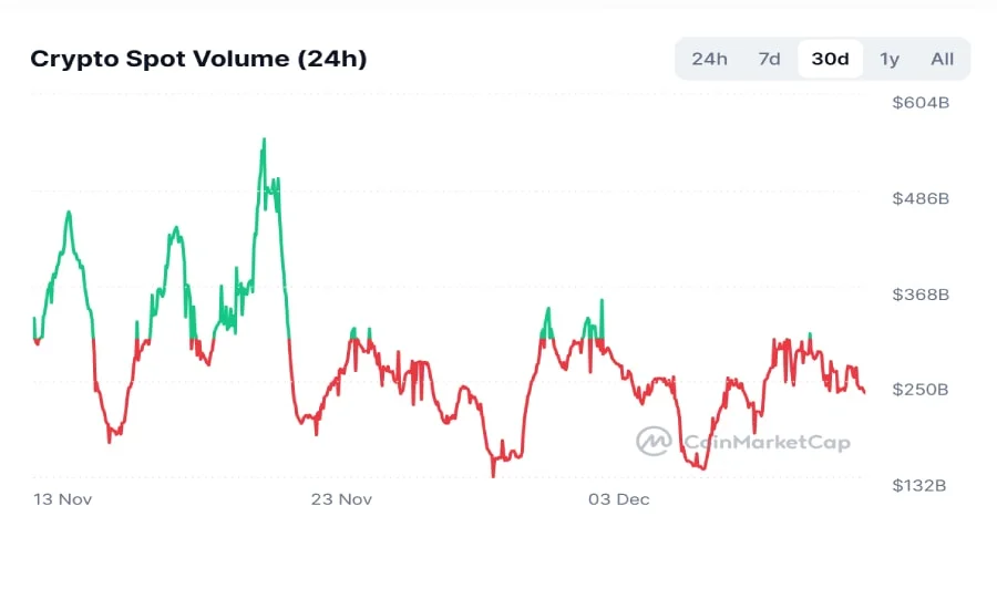 براساس دادههای کوینمارکتکپ، حجم معاملات اسپات بازار از بیش از ۵۰۰ میلیارد دلار در اوایل نوامبر به حدود ۲۵۰ میلیارد دلار رسیده است. در اواخر نوامبر و اوایل دسامبر، حجم معاملات در محدوده ۳۰۰–۳۵۰ میلیارد دلار تثبیت شد و در برخی موارد حتی به زیر ۲۰۰ میلیارد دلار رسید.