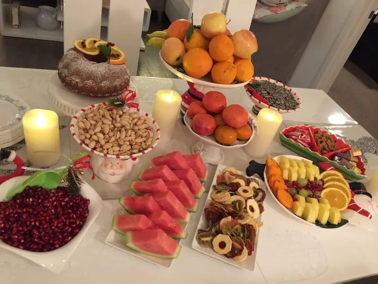 در شب یلدا بهغیراز انار و هندوانه اصولاً ظرف میوههای متنوع مانند سیب، پرتقال، ازگیل، خرمالو، کیوی، نارنگی و… دیده میشود که هرکدام خواص بسیاری دارند. مثلاً سیب بهعنوان میوهای خوش عطر با داشتن منبع غنی از ویتامینها برای سلامتی انسان بسیار مفید است. سیب همچنین به بهبود تنفس، درمان و پیشگیری از آسم، افزایش انرژی بدن، افزایش بینایی و بهبود دیابت نیز کمک میکند.