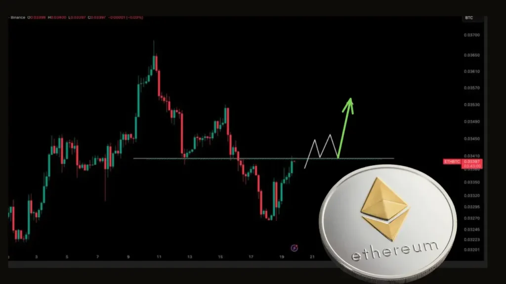 در نموداری که منتشر شده، قیمت اتریوم در برابر بیت کوین دقیقاً زیر یک خط مقاومتی افقی قرار دارد. این خط سفید رنگ که حوالی سطح ۰.۰۳۴۱۰ BTC کشیده شده است، مرز بین روند خنثی و شروع یک رالی قدرتمند است.
