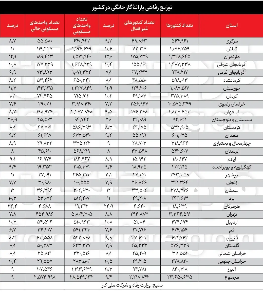 تازهترین آمارها از توزیع یارانه گاز خانگی در کشور نشان میدهد میزان واحدهای مسکونی خالی و تعداد کنتورهای فعال در استانها تفاوتهای قابلتوجهی دارد. بر اساس دادهها، استان سیستان و بلوچستان با 26.9 درصد واحدهای مسکونی خالی و نزدیک به 26 درصد کنتورهای خالی، بالاترین نرخ خالی بودن واحدها را در بین استانها دارد. پس از آن، استان هرمزگان با 24.4 درصد واحد مسکونی خالی و 24.9 درصد کنتور خالی قرار دارد.