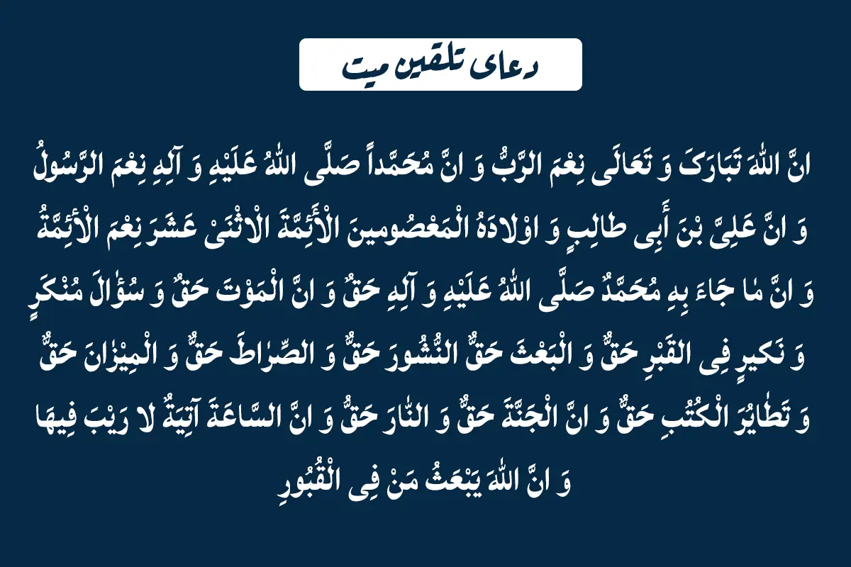 «ای فلانی، فرزند فلانی (نام شخص مرده و نام پدرش) آیا هنگام جدایی از ما برعهد و پیمان خود بودی که همان شهادت به یگانگی خدا و بندگی و رسالت محمد(ص) و وصایت علی بود و اینکه آنچه پیامبر(ص) آورده است همه بر حق بود»