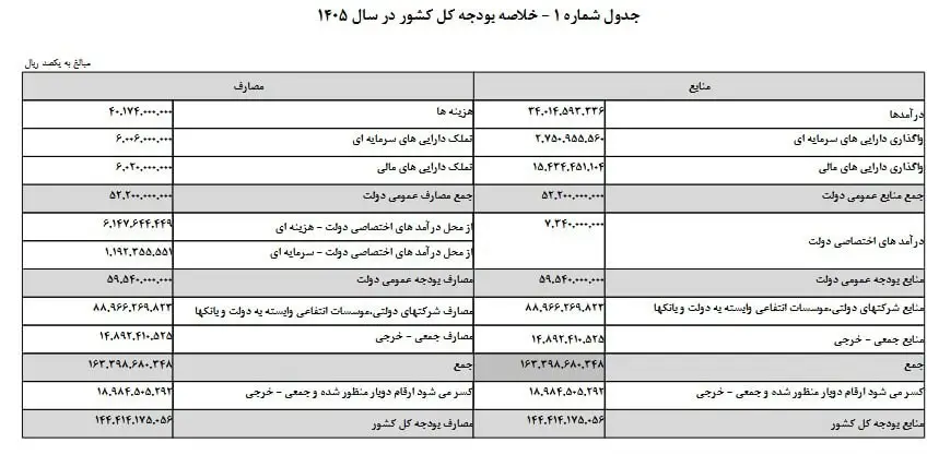 در این لایحه، درآمدهای اختصاصی دستگاهها 70 میلیارد تومان برآورد شده و منابع بودجه عمومی دولت در مجموع به 590 میلیارد تومان میرسد. همچنین منابع شرکتهای دولتی، بانکها و مؤسسات انتفاعی وابسته به دولت 880 میلیارد تومان پیشبینی شده و در نهایت، منابع بودجه کل کشور در سال 1405 رقمی حدود یکهزار و 144 میلیارد تومان را نشان میدهد.