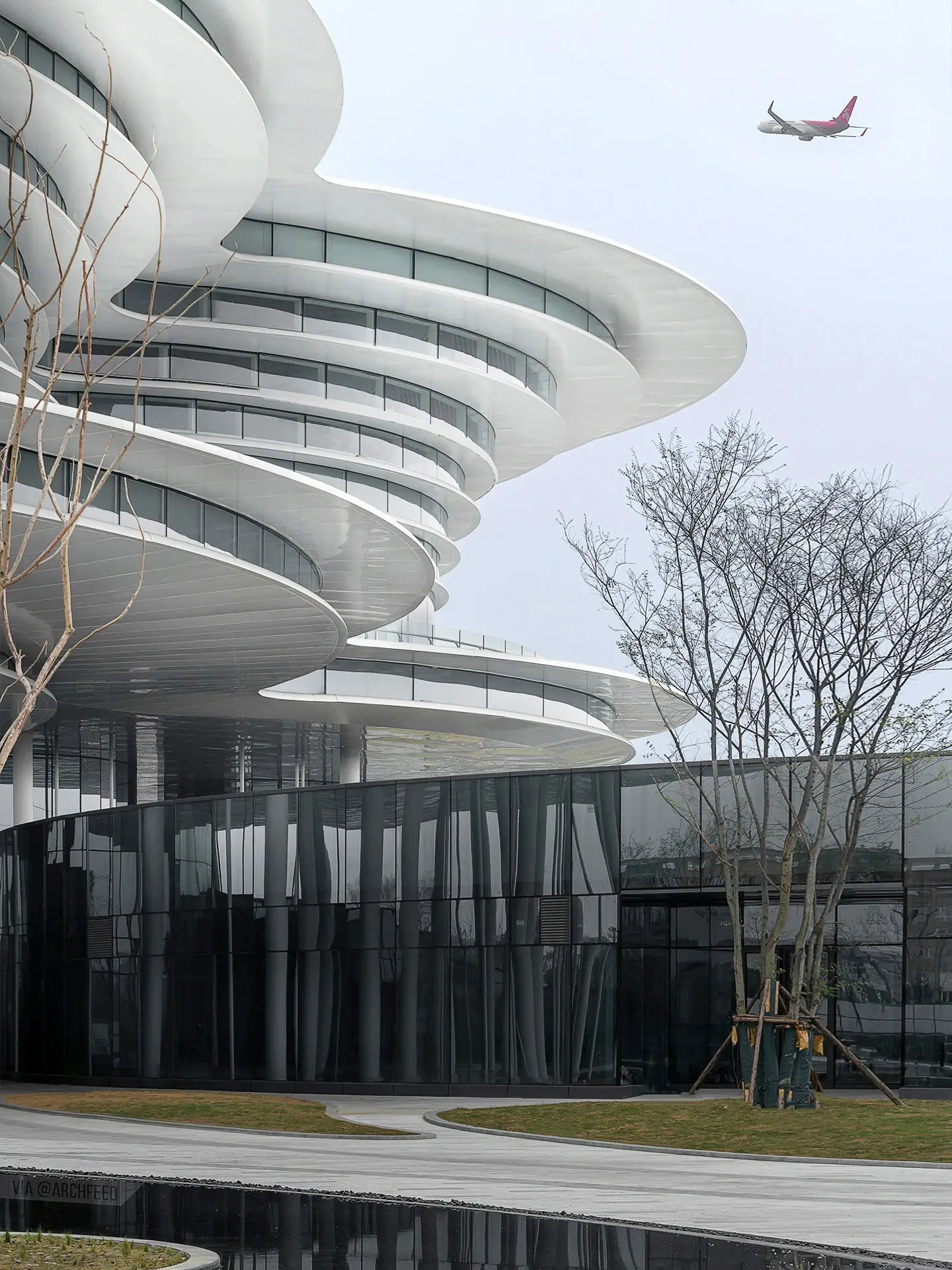 مرکز نمایشگاهی فرودگاه بینالمللی شوانگلیو در چنگدو با الهام از ابرها، فضایی معلق و سبز خلق کرده که تماشای برخاستن و فرود هواپیماها را به تجربهای بینظیر تبدیل میکند.