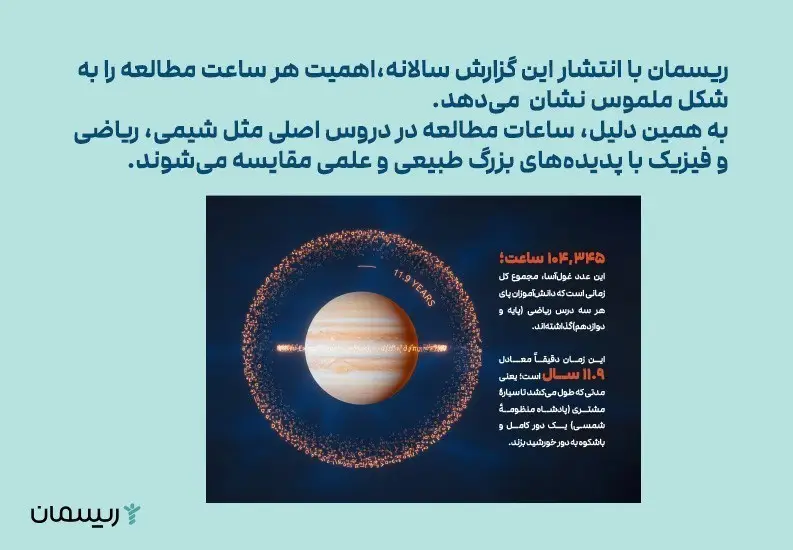 ریسمان با انتشار این گزارش سالانه، قصد دارد اهمیت هر ساعت مطالعه را به شکل ملموس نشان دهد. به همین دلیل، ساعات مطالعه در دروس اصلی مثل شیمی، ریاضی و فیزیک با پدیدههای بزرگ طبیعی و علمی مقایسه میشوند. برای مثال، مجموع این ساعتها برابر با زمان گردش سیارهها یا مسیر پرتاب یک فضاپیما به پلوتون است. این تشبیهها نهتنها باعث جذابیت گزارش میشود، بلکه به دانشآموز نشان میدهد که هر ساعت مطالعه، بخشی از مسیر بزرگ و واقعی موفقیت است.