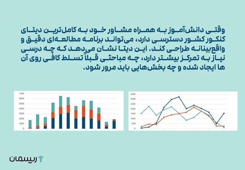 مشاوران با کمک این دیتا، میتوانند روند یادگیری دانشآموز را تحلیل کنند و برنامهای دقیق و هدفمند طراحی نمایند. آنها میتوانند ببینند که در کدام مباحث دانشآموز ضعیف عمل کرده و در کدام بخشها تسلط دارد. این تحلیلها به ویژه در سالهای حساس کنکور اهمیت زیادی پیدا میکنند، چرا که کوچکترین تغییر در برنامهریزی میتواند نتیجه نهایی را تحت تأثیر قرار دهد.