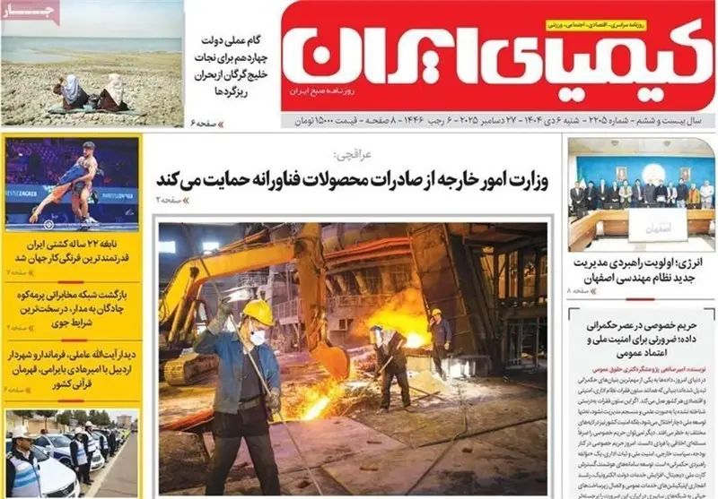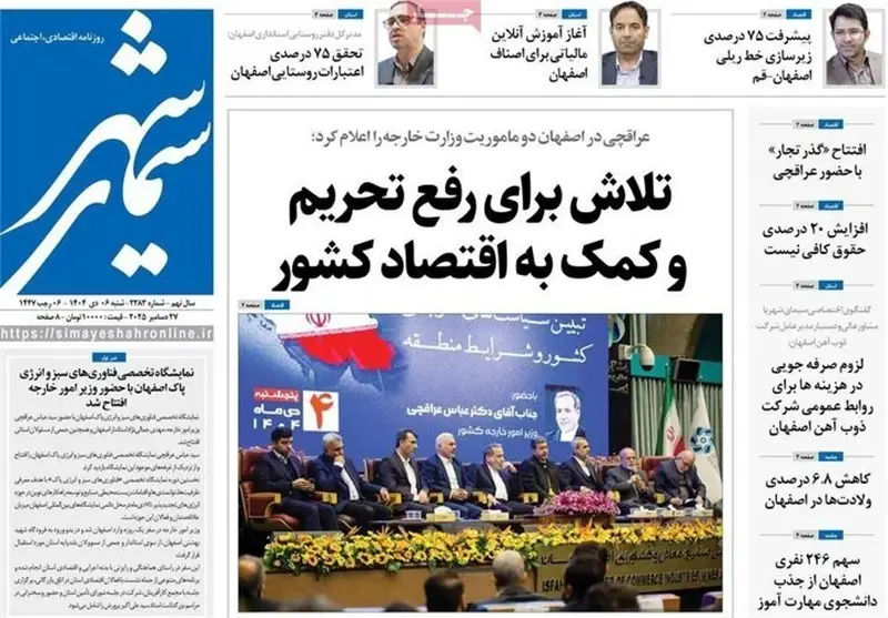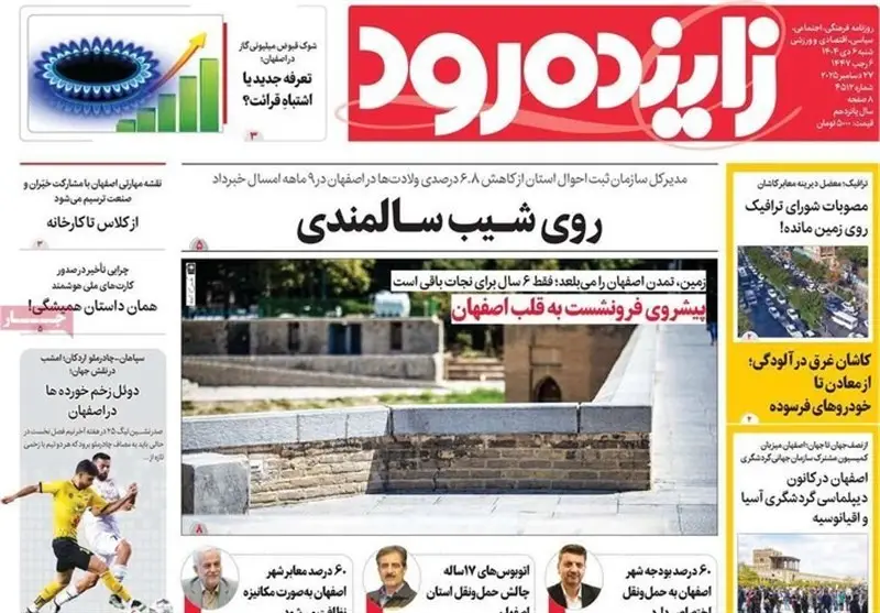 صفحات نخست روزنامههای شنبه 6 دی اصفهان با نگاهی ویژه به تأثیرات خودتحریمی بر ثبات اقتصادی، مهمترین رویدادهای سیاسی، اجتماعی و اقتصادی استان و کشور را به تصویر کشیدهاند.