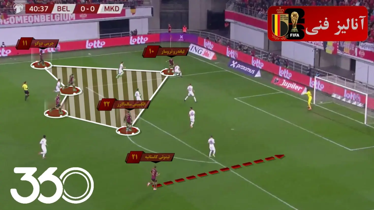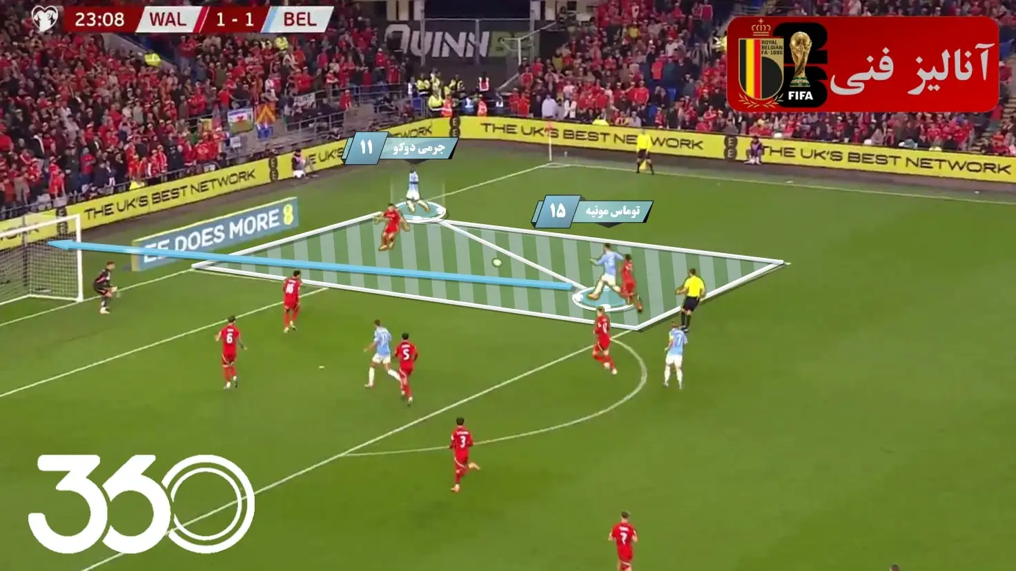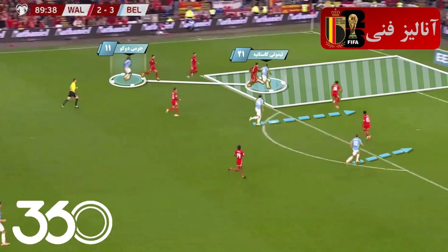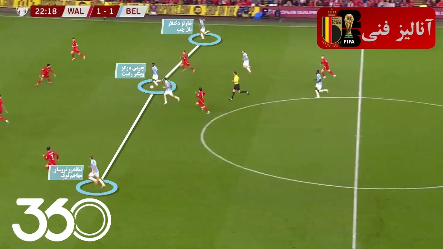 همین اتفاق در گل دوم بلژیک برابر ولز با گلزنی توماس مونیه (مدافع کناری سمت راست) از نیمفضا و با حرکت دوباره دوکو نیز رقم خورد.