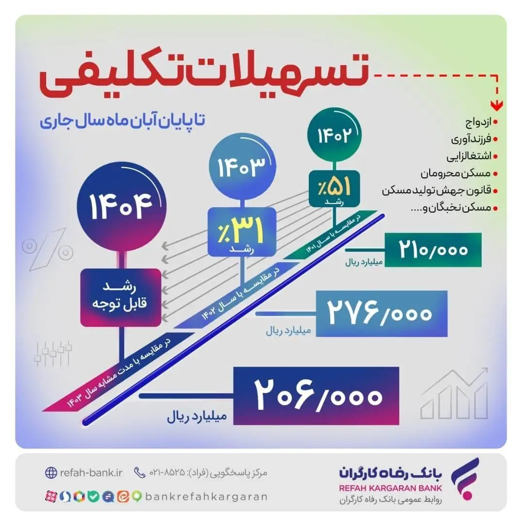 بر اساس این گزارش، بانک رفاه کارگران در سال 1403 حدود 276.000 میلیارد ریال تسهیلات در سرفصلهای تکلیفی پرداخت کرده که با افزایش 31 درصدی در مقایسه با سال 1402 همراه بوده است.