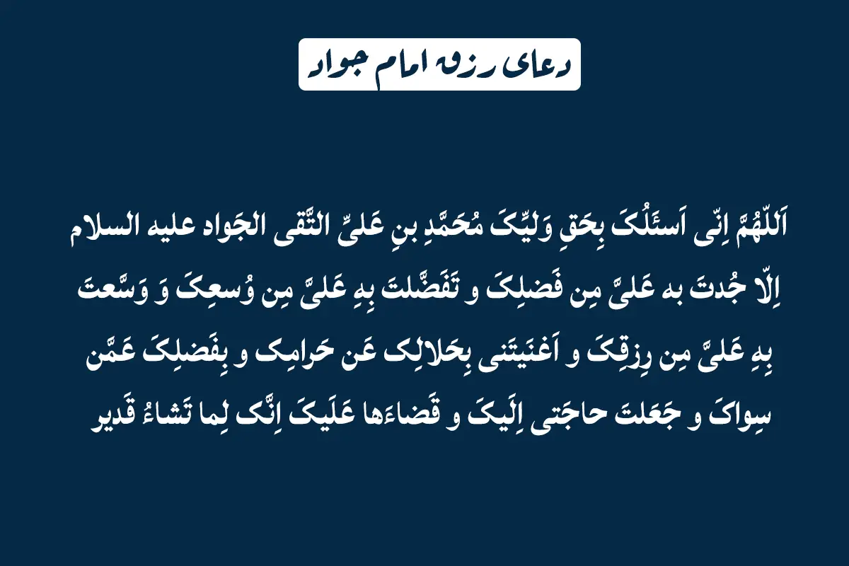 اللَّهُمَّ إِنِّی أَسْأَلُکَ بِحَقِّ وَلِیِّکَ مُحَمَّدِ بْنِ عَلِیٍّ عَلَیْهِ السَّلَامُ إِلَّا جُدْتَ بِهِ عَلَیَّ مِنْ فَضْلِکَ وَ تَفَضَّلْتَ بِهِ عَلَیَّ مِنْ وُسْعِکَ وَ وَسَّعْتَ عَلَیَّ رِزْقَکَ وَ أَغْنَیْتَنِی عَمَّنْ سِوَاکَ وَ جَعَلْتَ حَاجَتِی إِلَیْکَ وَ قَضَاهَا عَلَیْکَ إِنَّکَ لِمَا تَشَاءُ قَدِیرٌ