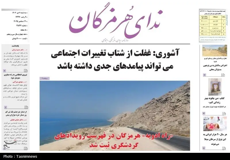 در تازهترین شماره روزنامههای محلی هرمزگان، محور اصلی مطالب به موضوعات متنوعی از حوزه اجتماعی،اقتصاد و مسایل زیست محیطی مرتبط با استان اختصاص یافته است؛ موضوعاتی که تصویری جامع از دغدغهها و اولویتهای روز استان ارائه میدهد.