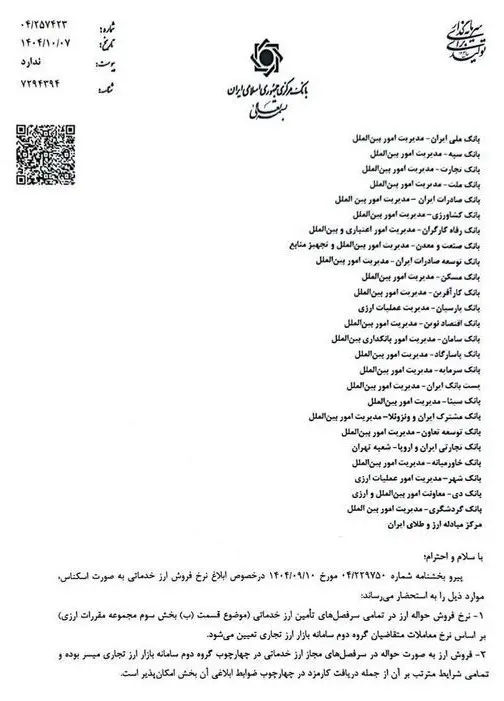بانک مرکزی با صدور ابلاغیهای جدید اعلام کرد از 15 دیماه، نرخ فروش حواله ارز در تمامی سرفصلهای تأمین ارز خدماتی، بر اساس قیمت معاملات متقاضیان گروه دوم در سامانه بازار تجاری تعیین خواهد شد.