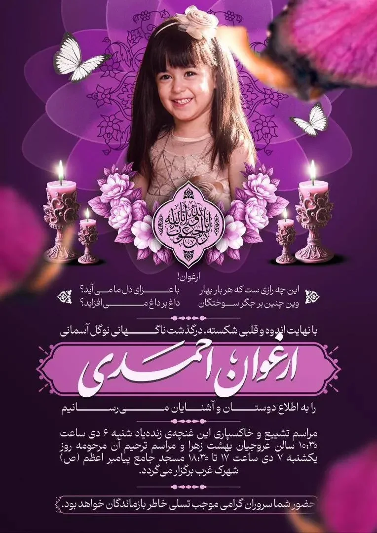به گزارش نمابان و به نقل از پلاس، درگذشت ناگهانی ارغوان احمدی، دختر خردسال محمدرضا احمدی مجری مطرح صداوسیما، به دلیل ابتلا به آنفولانزا و درگیری ریه باعث موجی از تأثر و واکنشها در فضای رسانهای شد.