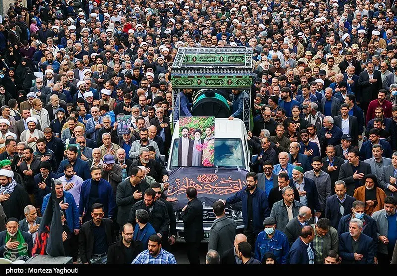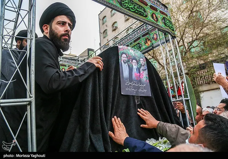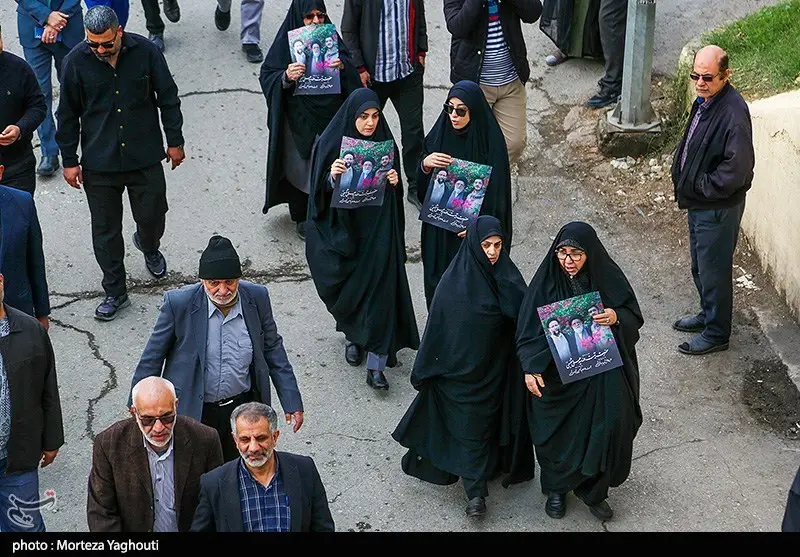 دستان تشییعکنندگان بیکار نمینشینند. یا گرم بالا نگه داشتن عکس و پوستر آیتالله و فرزندانشان هستند یا مشغول گرفتن اشک چشمشان. به هر صورتی که نگاه میکنم، سرخ است و خیس از اشک. اینکه حال و روز مردم است، خدا میداند چه غمی به دل نزدیکان آیتالله آوار شده. مداح روضه ظهر عاشورا میخواند.