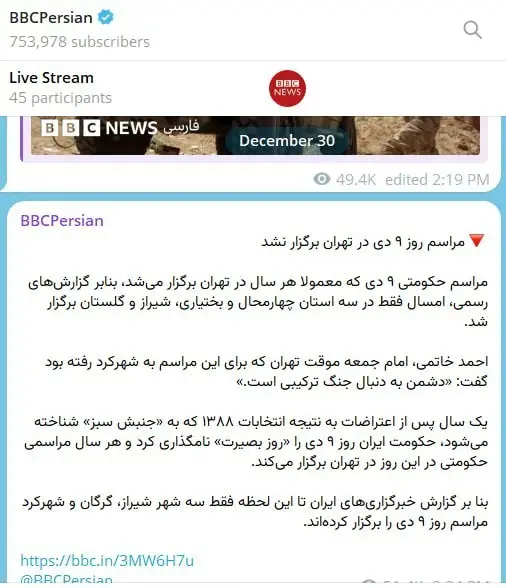 به گزارش خبرنگار سیاسی نمابان و به نقل از خبرگزاری تسنیم، بیبیسیِ فارسی عصر امروز در خبری نوشت که مراسم «مراسم روز 9 دی در تهران برگزار نشد»!