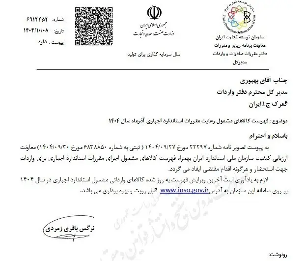 بخشنامه سازمان توسعه تجارت ایران درباره فهرست جدید کالاهای مشمول رعایت مقررات استاندارد اجباری ابلاغ شد.