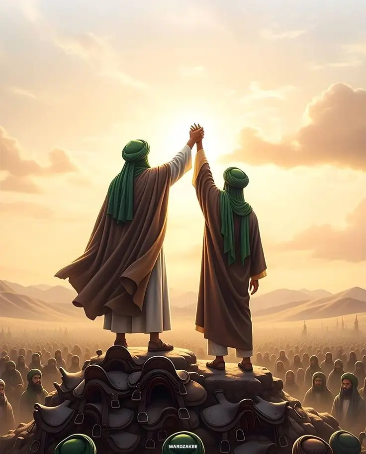 سپس پیامبر (ص) دست حضرت علی (ع) را بالا گرفت و فرمود: «ای مردم! در نزد مؤمنان سزاوارتر از خودشان كیست؟» مردم گفتند: «خداوند و پیامبر او بهتر میدانند» سپس پیامبر فرموند: «ای مردم! هر كس من مولا و رهبر او هستم، علی هم مولا و رهبر اوست» و این جمله را سه بار تكرار فرمودند. بعد مردم این انتخاب را به حضرت علی (ع) تبریک گفتند و با وی بیعت نمودند.