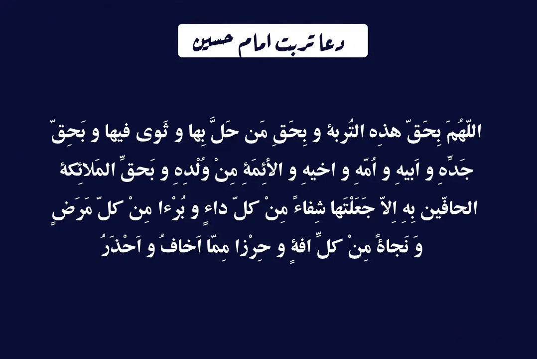 بار خدایا! به حقّ محمّد صلىاللهعليهوآله که بنده و رسول و حبیب و نبی و امین توست و به حق امیرالمؤمنین علی بن ابی طالب عليهالسلام که بنده و برادر و رسول تو است و به حق فاطمه عليهاالسلام که دختر نبی و همسر ولی تو است و به حق حسن و حسین عليهماالسلام و به حق امامان که هادیان و راهنمایان هستند به حق این تربت و به حق فرشتهای که موکل «گماشته» بر آن است و به حق وصىّ که در آن آرمیده و به حق جسم و کالبدی که این تربت آن را در خود گرفته و به حق سبط [نوه] پیامبر که در این تربت است و به حق تمام فرشتگان و انبیا و فرستادگانت، درود فرست بر محمّد و آل محمّد صلىاللهعليهوآله و این تربت را برای من و برای هر کس که با آن استشفا میجوید شفا از هر درد و مرض و امان از هر خوف و هراسی قرار بده. خداوندا به حق محمّد صلىاللهعليهوآله و اهل بیتش آن را دانشی سودمند و رزقی بسیار و شفایی از هر درد و مرض و آفت و عیب و از تمام دردها قرار بده همانا تو به هر چیزی قادر و توانایی.