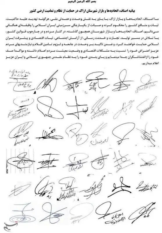 کسبه و بازاریان در اراک در این بیانیه با تاکید بر اینکه “هرگونه تهدید علیه حاکمیت، ثبات و منافع کشور را محکوم مینماییم” اظهار کردند: در کنار مردم و در چهارچوب قوانین کشور با تلاش در مسیر تولید تجارت و خدمت رسانی از آرامش اجتماعی ثبات اقتصادی و پیشرفت ایران اسلامی حمایت خواهیم کرد.