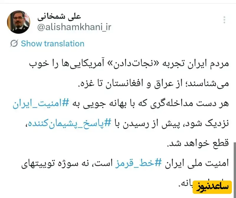 ساعدنیوز: شمخانی در واکنش به توییت امروز ترامپ گفت: مردم ایران تجربه «نجاتدادن» آمریکاییها را خوب میشناسند؛ از عراق و افغانستان تا غزه. هر دست مداخلهگری که با بهانه جویی به امنیت ایران نزدیک شود، پیش از رسیدن با پاسخ پشیمانکننده، قطع خواهد شد.امنیت ملی ایران خط قرمز است، نه سوژه توییتهای ماجراجویانه.
