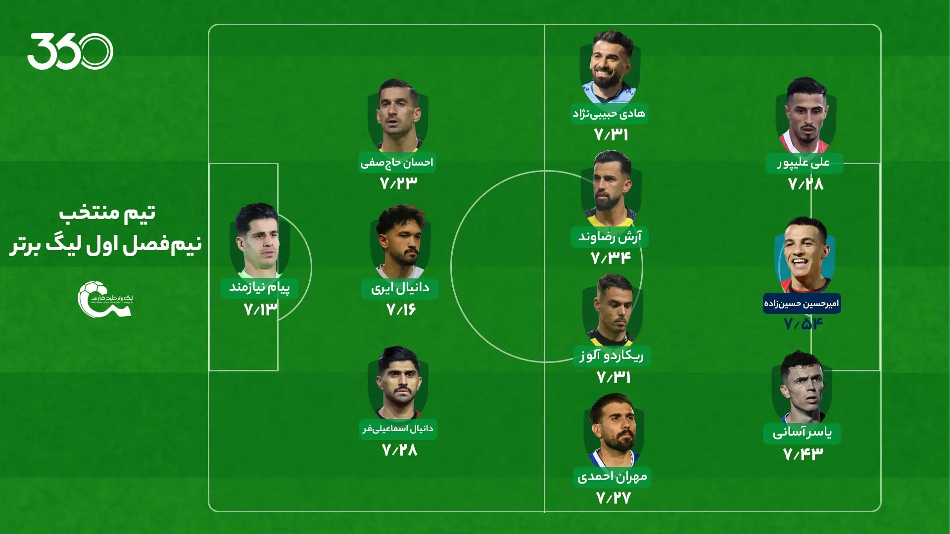 به گزارش نمابان و به نقل از فوتبال 360، نیمفصل نخست لیگ 25 با صدرنشینی تیمِ محرم نویدکیا به پایان رسید. در این نیمفصل، آرش رضاوند همه را غافلگیر کرد و یکی از 3 بازیکن برتر فصل بود. احسان حاجصفی هم در سال جام جهانی، برای کادرفنی تیم ملی پیغام درخشانی فرستاد. ریکاردو آلوز، بهترین بازیکن خارجی چند فصل اخیر لیگ برتر هم دیگر نماینده سپاهان در این تیم است.