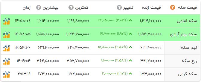 به گزارش آخرین خبر و تا لحظه تنظیم این خبر؛ سکه امامی با رشد 2 میلیون و 405 هزار تومانی قیمت، 121 میلیون و 410 هزار تومان به ثبت رسید. نیم سکه نیز با رشد 1 میلیون و 580 هزار تومانی قیمت، 63 میلیون و 140 هزار تومان ارزش گذاری شد.